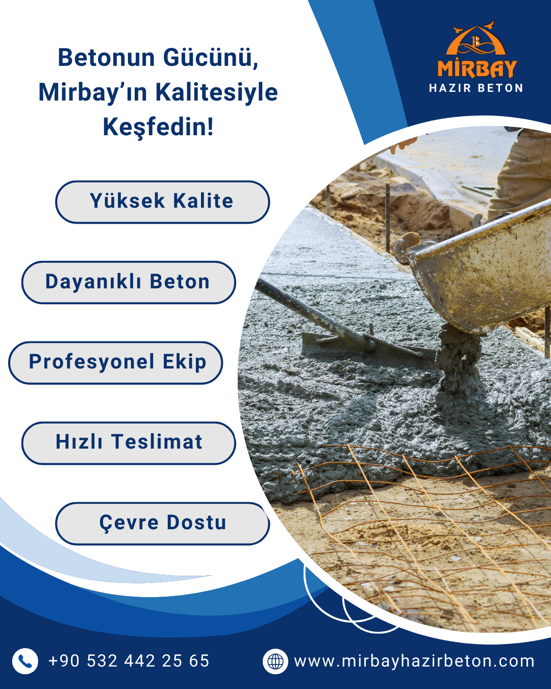 Mirbay Hazır Beton olarak, projelerinizin gereksinimlerine uygun en doğru beton çözümlerini sunuyoruz. Alanında uzman mühendislerimiz, projeniz için en uygun beton karışımını belirleyerek maksimum verimlilik sağlıyor. Yüksek mukavemetli, su geçirmez, hızlı kuruyan ve esnek beton çözümlerimizle inşaat süreçlerinizi hızlandırıyor ve yapılarınıza değer katıyoruz.